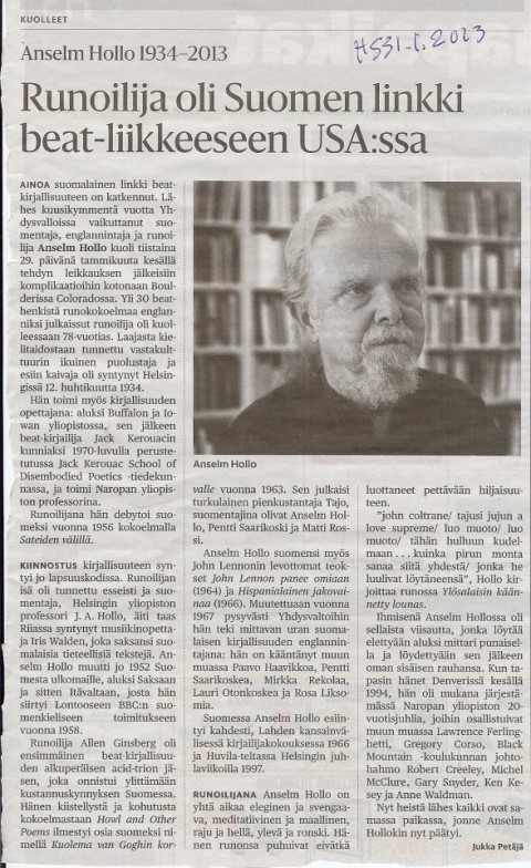 Also, today (Thursday 31st) he Finnish Obituary in Helsingin Sanomat (the biggest Finnish newspaper), written by one of the editors of the Cultural Section. Anselm is remembered as having been “Finlands link to the Beat Movement in US”. (via Leevi Lehto on FB):