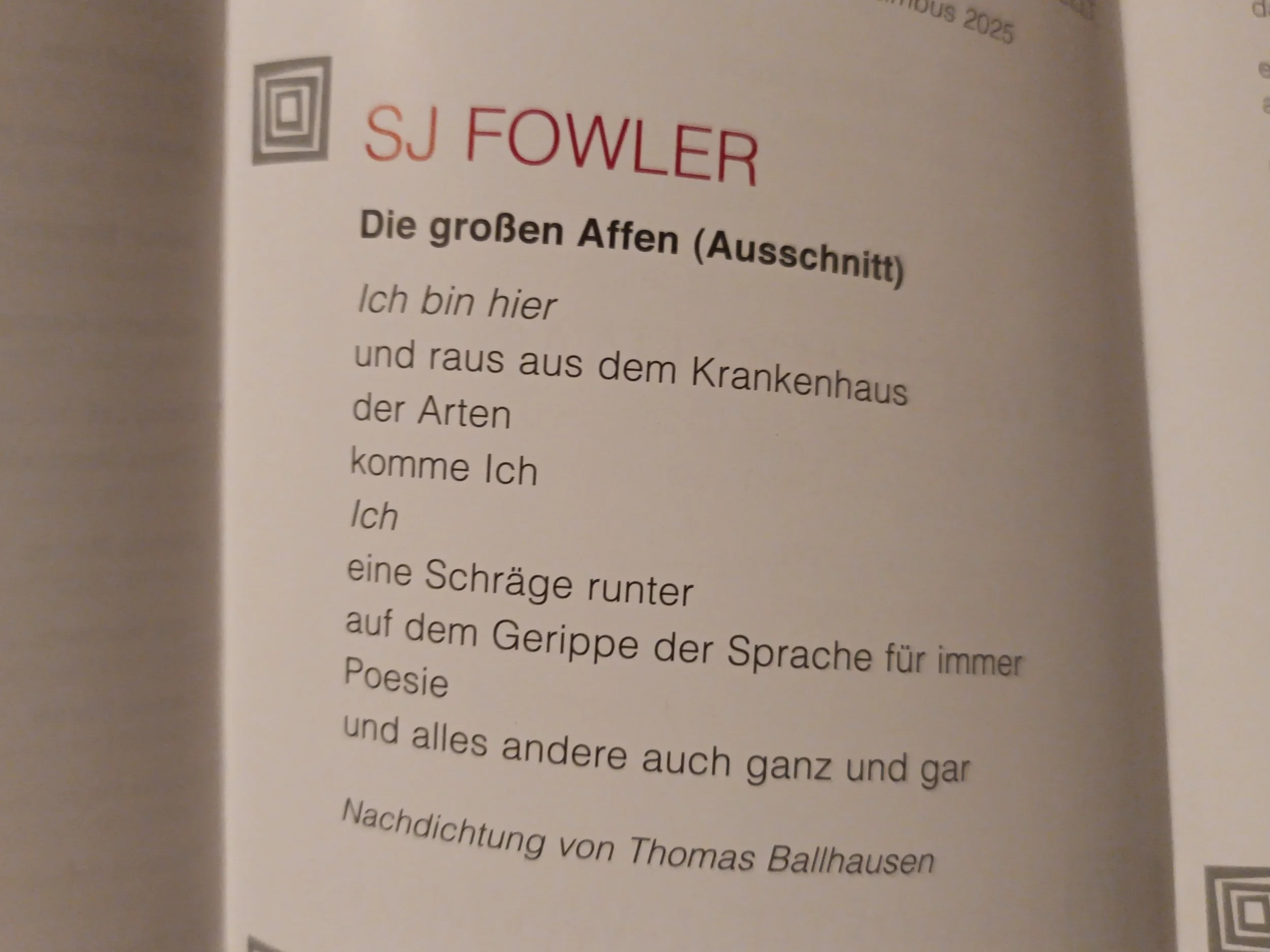 Thanks to Thomas Ballhausen an excerpt from my long poem cycle The Great Apes has been translated into German and included in a great tradition in Austrian literature - The Poetry Flyer from Podium Literature.